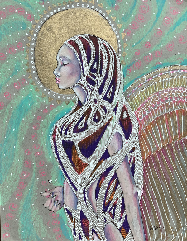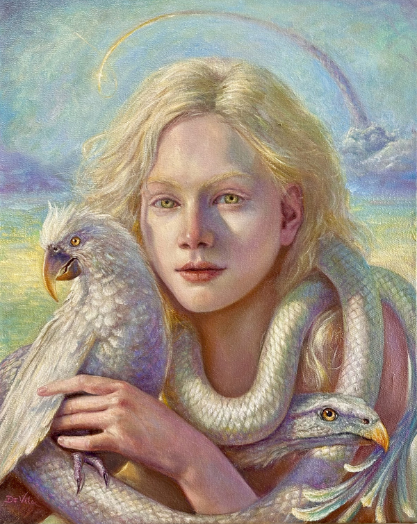 LYNDA DE VITA’s artist statement: Beyond mere wakefulness, my paintings delve into the awakening of the spirit. I create portraits of the soul—seeking to reveal what truly matters within us, something that exists beyond time and the physical body. My work is a pursuit of the purest expressions of energy, emotion, and love. It reflects an awareness of what genuinely awakens us—what stirs our senses to life, allowing them to expand and flourish from the root to the crown, and beyond. I remain endlessly captivated by the challenge of capturing that elusive spark—the 21 grams of magic within every individual.